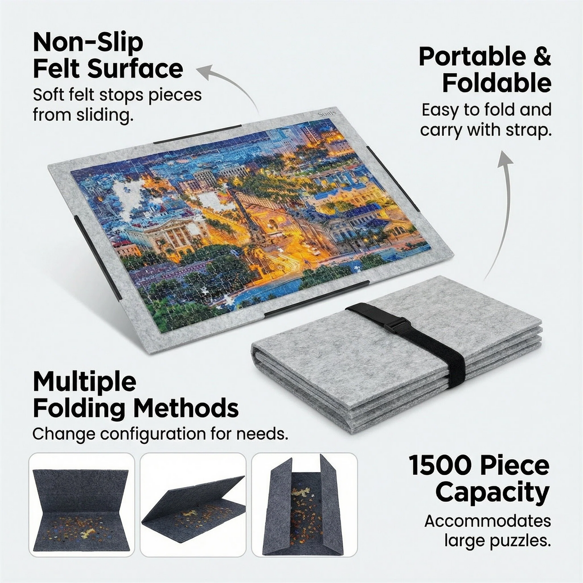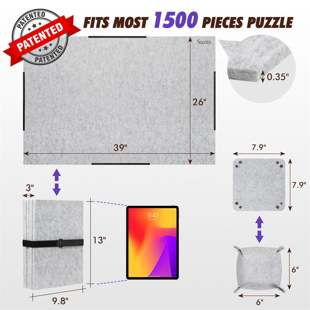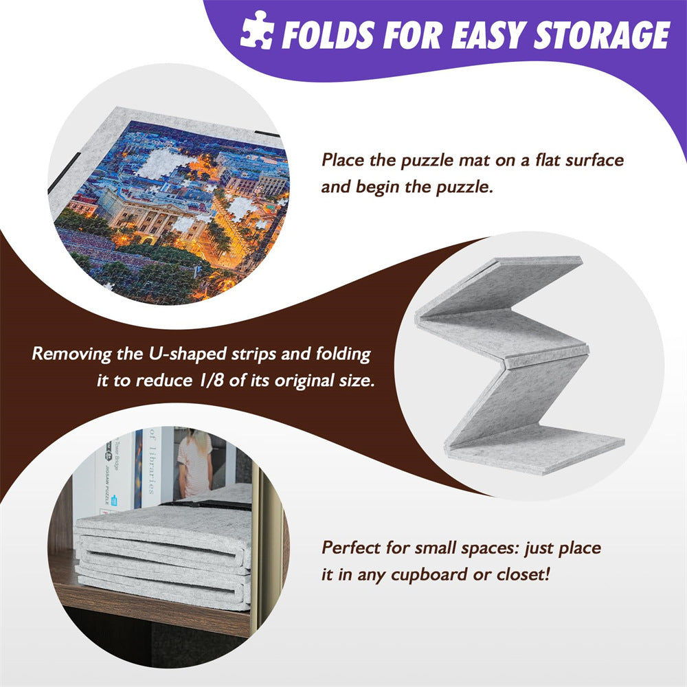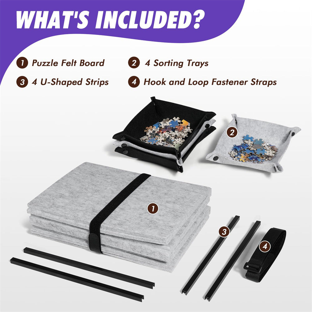 Introducing your ultimate puzzle companion—the Knitpuzzle Felt Puzzle Board, cleverly designed for both convenience and comfort. Made from premium felt fabric, this board is durable, resistant to bending, and firmly holds puzzle pieces in place. Weighing only 4.5 lbs (approximately 2 kg), it's 30-50% lighter than traditional wooden puzzle boards, making it easy to move and store, and suitable for seniors.